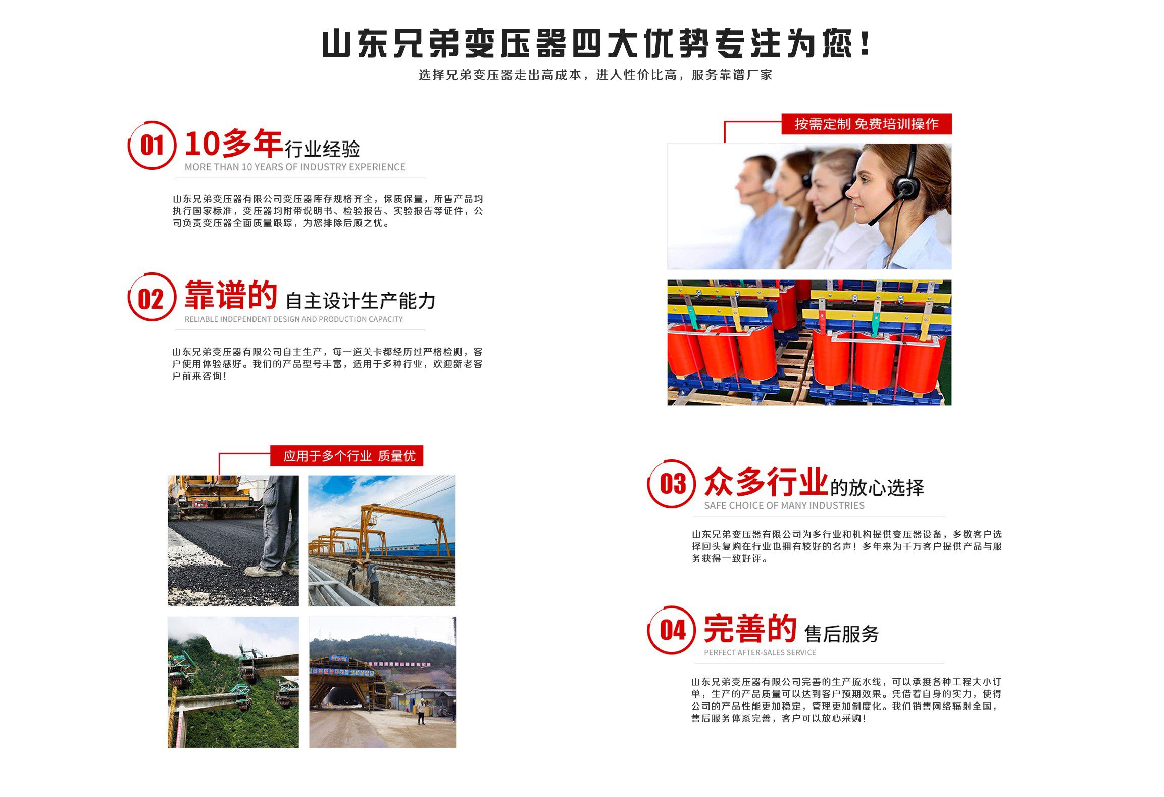 山東兄弟變壓器有限公司經營SCB10干式變壓器,SCB11干式變壓器價格,SCB12變壓器,SCB13干式變壓器,SCB14干式變壓器,SCB18干式變壓器等產品及用戶要求的特殊變壓器?! 」镜馁|量方針是:“顧客的滿意,是我公司的追求?!眻猿仲|量,用戶至上,以質興業,以優取勝,愿為廣大用戶設計各種要求的變壓器,以求共同發展?! ∑髽I精神:“創新、求實、誠信、高效”。 企業作風:“嚴、細、實、快”。 企業工作方針:“加強內部管理,夯實基礎,全面提高職工整體素質,使企業管理水平再上新的臺階”。 公...